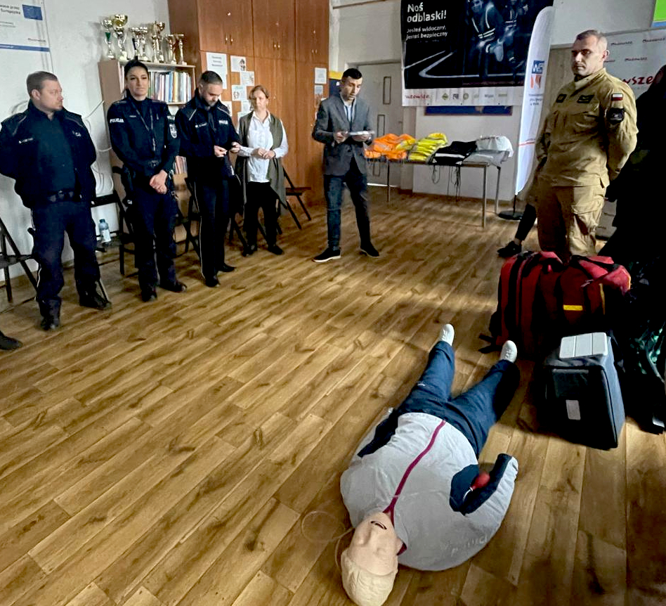 Wśród istotnych elementów działań nie mogło zabraknąć także umiejętności udzielania pierwszej pomocy. Wiedzę teoretyczną, ale przede wszystkim praktyczną w tym zakresie przekazywał uczestnikom funkcjonariusz Państwowej Straży Pożarnej w Grodzisku Maz. Ćwiczenia na fantomie pomagały oswoić się z różnymi sytuacjami i uczyć konkretnych czynności na miejscu zdarzenia drogowego, w których najważniejsze jest szybkie udzielenie pomocy.
