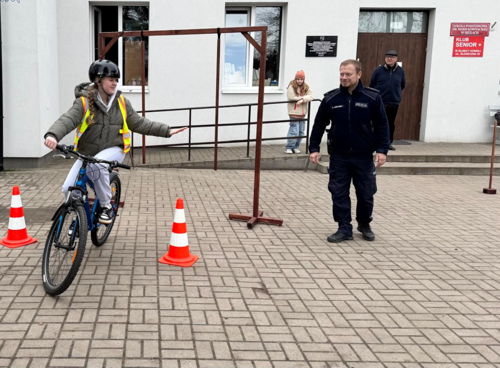 W czasie spotkania wszyscy uczestnicy poznawali lub przypominali sobie zasady poruszania się po drogach jako piesi, rowerzyści i użytkownicy hulajnóg czy innych pojazdów. Od pierwszych słów Pani dyrektor wszyscy organizatorzy zachęcali uczniów do używania elementów odblaskowych i podkreślali jak prawdziwe jest główne hasło kampanii „Jesteś widoczny, jesteś bezpieczny”. Przekazana wiedza teoretyczna już po chwili uzupełniana była przez policyjnego profilaktyka, kierownika i dzielnicowego z Posterunku Policji w Żabiej Woli podczas praktycznej lekcji na rowerowym torze przeszkód. Policjanci dbali o to, aby każdy uczeń wyposażony w kask ochronny i kamizelkę odblaskową miał okazję przećwiczyć nie tylko samą umiejętność jazdy ale przede wszystkim czynności, jakie rowerzysta musi wykonać w czasie podróży.