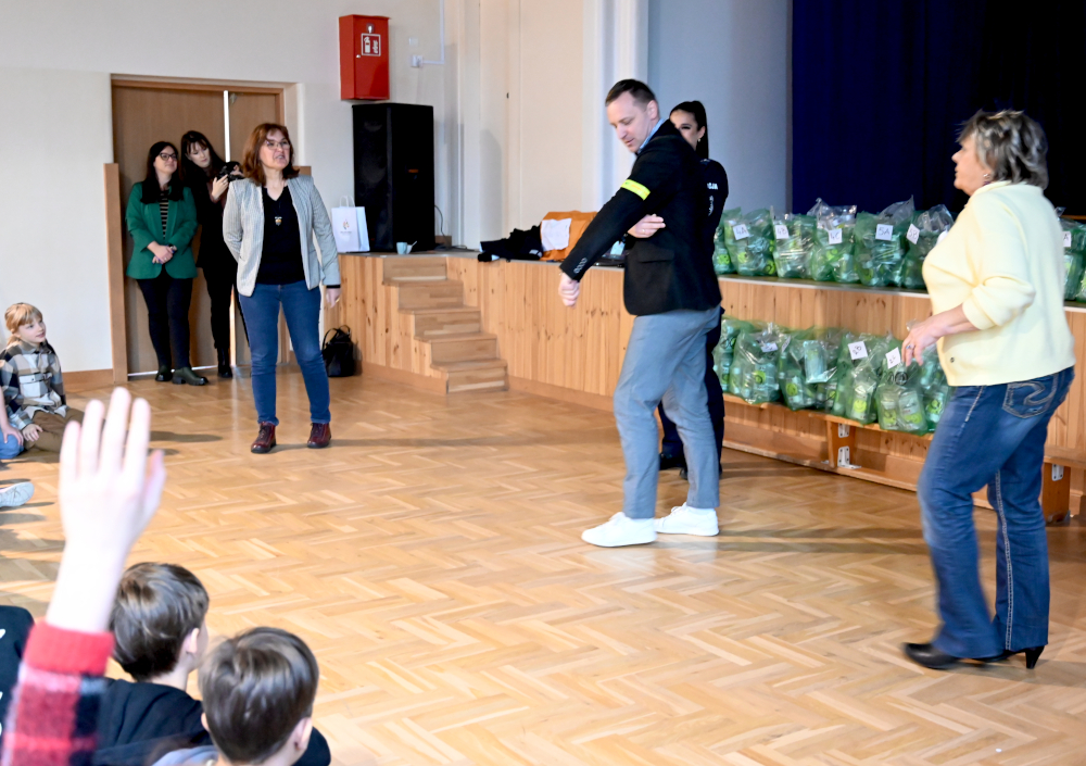 Policjantka grodziskiej komendy zajmująca się profilaktyką społeczną w ostatni wtorek została zaproszona przez przedstawicieli Urzędu Miasta Milanówka do udziału w działaniach edukacyjnych dla uczniów Szkoły Podstawowej Nr 1. W placówce czekali już uczestnicy zaplanowanych spotkań z dyrekcją i gronem pedagogicznym oraz organizatorzy działań. Burmistrz Milanówka Artur Niedziński i Prezes Fundacji „Nadzieja” Pani Dorota Stalińska przybliżyli uczniom cel zajęć i podkreślali potrzebę regularnego poznawania zasad bezpieczeństwa na drogach. Szczególnie zachęcali do korzystania z elementów odblaskowych, które w znacznym stopniu poprawiają widoczność pieszych i rowerzystów. Dla każdego ucznia przygotowane były zestawy odblaskowych przedmiotów.