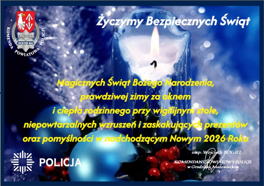 Z okazji Świąt Bożego Narodzenia policjanci i pracownicy Komendy Powiatowej Policji w Grodzisku Maz. życzą wszystkim mieszkańcom powiatu grodziskiego oraz osobom spędzającym ten czas na naszym terenie, aby był to czas rodzinnego ciepła i radości, przeżyty w zdrowiu i zgodzie, a przede wszystkim bezpieczny w każdym miejscu. Niech ta wyjątkowa atmosfera spokoju pozostanie i towarzyszy wszystkim w całym 2026 roku.