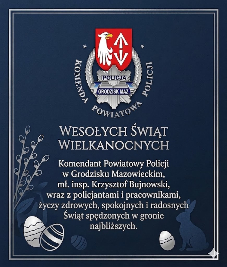 Z okazji Świąt Wielkiej Nocy policjanci i pracownicy Komendy Powiatowej Policji w Grodzisku Mazowieckim życzą wszystkim mieszkańcom powiatu i osobom spędzającym ten okres na naszym terenie dużo wiosennej radości i optymizmu oraz samych miłych chwil w gronie rodzinnym, a przede wszystkim bezpiecznie spędzonego czasu w domu i w podróży.